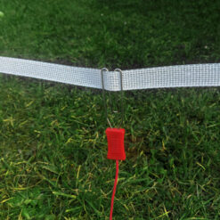 First place the eyelet end on to the fence terminal of the energiser, and then simply slide the heart shape clip onto polytape or electric fencing wire as shown.